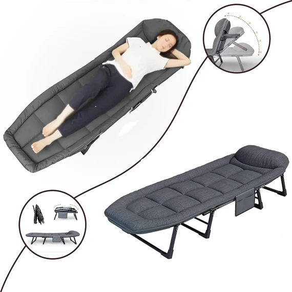 A foldable and adjustable bed with an integrated design featuring 6 backrest positions and a durable steel frame.