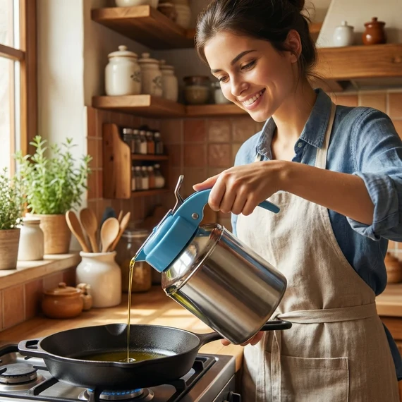 The oil dispenser features a comfortable lid and a pressure mechanism for easy and precise pouring, allowing you to control the oil flow effortlessly.